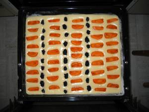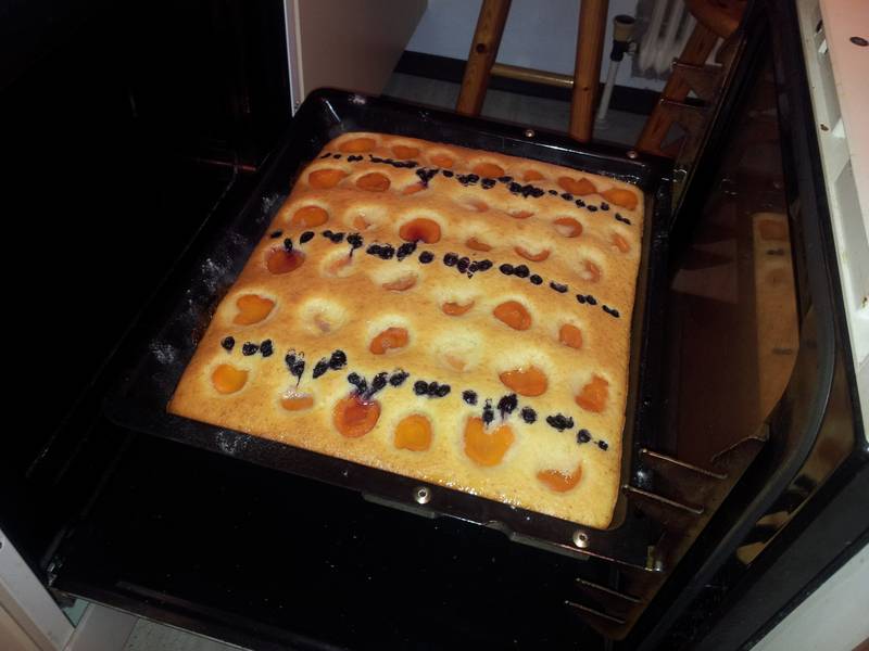 den Patz ausn Topf aufs Blech, Früchte drauf (z.b. Erdbeeren und Rhabarber abwechselnd)